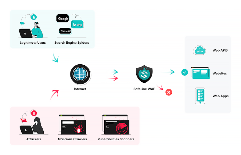 El WAF SafeLine es un firewall de aplicaciones web autoalojado que actúa como proxy inverso, filtrando y monitorizando el tráfico HTTP/HTTPS para bloquear solicitudes maliciosas antes de que lleguen a sus aplicaciones web backend. A diferencia de los WAF en la nube, SafeLine se ejecuta completamente en sus propios servidores, lo que le ofrece una visibilidad y una soberanía de datos inigualables.